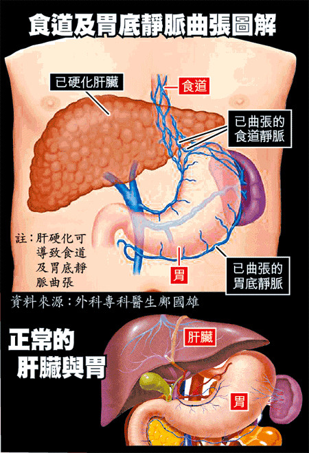 靜脈曲張及爆裂屬於肝硬化併發症,鄺國雄解釋,由於肝硬化導致肝臟滿佈疤痕,阻礙血夜流動,「谷脹」周邊食道末端及胃底靜脈,形成靜脈曲張,靜脈直徑可由1毫米脹至5至10毫米,「本來係頭髮咁幼,變咗手指咁粗。」