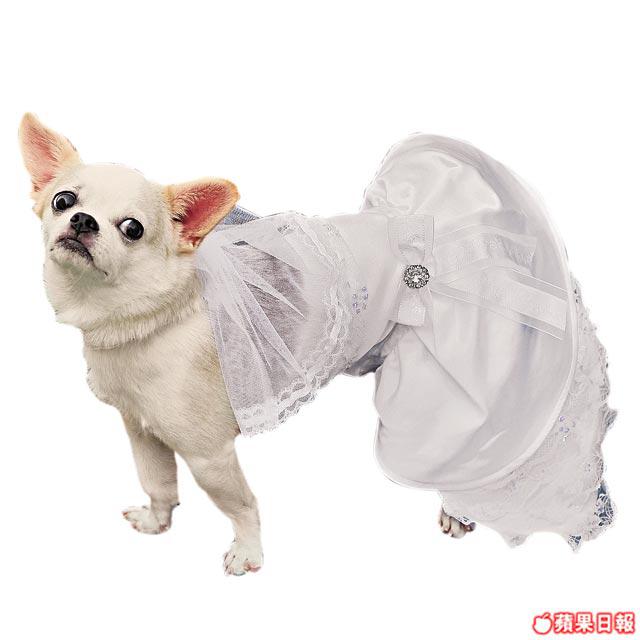 《走》中的Chloe出親大場面都由頭裝扮到落腳,上自華麗帽子、下至閃令令鞋仔,都是襯到絕一絕。然而,香港寵物店沒有華麗帽子出售,故狗主只能從服裝裏着手,長長狗婚紗夠晒浮誇,單穿華麗狗裳依然可帶出小狗高雅的韻味。