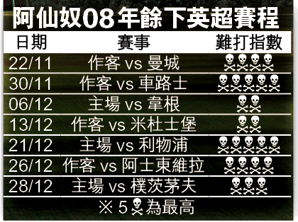 就算沙格拿及伊保爾預計12月可復出,但若接連不敵曼城及車路士,積分差距便會越來越大,士氣亦會進一步受打擊;屆時即使右路「修復」,要力追前4亦大有難度,故說08年餘下秩序惡踢。