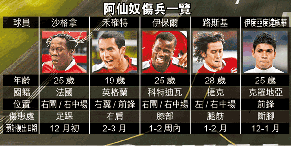 阿仙奴本周六聯賽作客曼城,雖然有前鋒尹佩斯停賽期滿復出,射手艾廸巴約亦料已傷癒可擔正,但比賽狀態始終存疑;加上法比加斯停賽,如今大勇的禾確特受傷,要從上輪主場負阿士東維拉0:2中復蘇,並不容易。領隊雲格也只能希望其他13名參加周三國際熱身賽的球員,最終可以健康歸來。