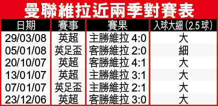 曼聯聯賽迄今失掉12分,爭標之路往後不容再失,原來近兩季紅魔對維拉全勝兼多大炒對手,今仗正好追「大」!