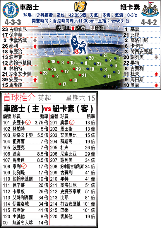 周六英超聯賽事,榜首的車路士主場面對下游的紐卡素,理應獅子撲兔;但考慮主隊多名國腳為國家隊耗力甚多,加上客軍前鋒奧雲復出,足以搗亂大局,冷敲車仔小勝一球,博「讓球主客和」「和局」。(球賽編號:星期六15;now631台今日11:00pm直播)