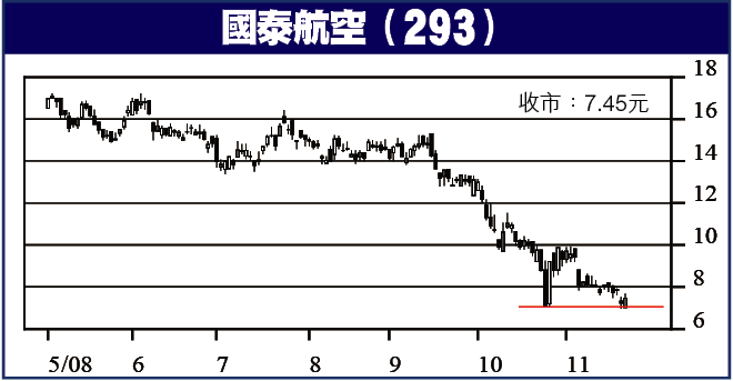 國泰10月份載客量雖升2.6%,但載客率跌5.3%至75.5%;年尾雖係旅遊旺季,但今年港人留港消費料增,估計國泰股價後市仍要尋底,或會考驗01年低位6元水平。