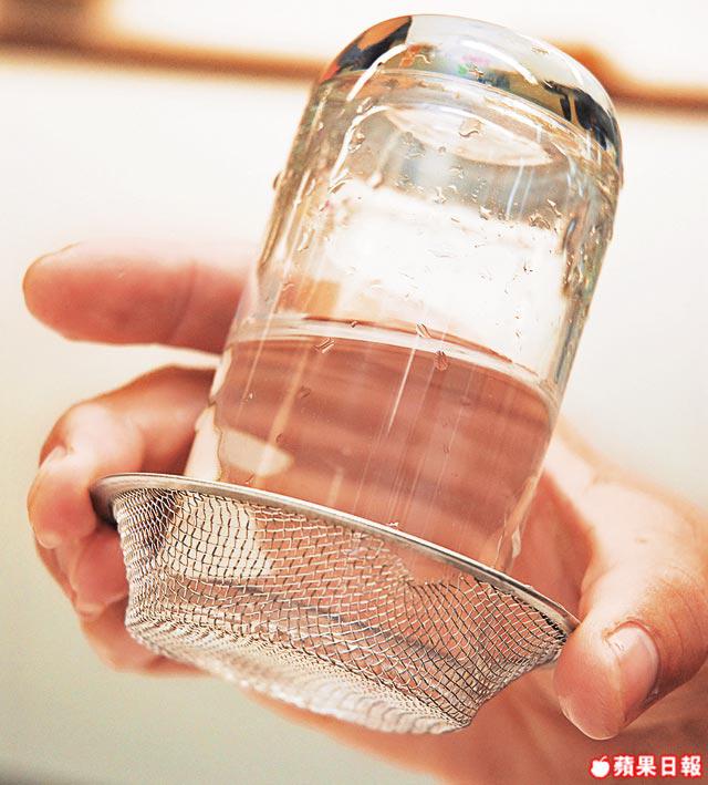 1. 玻璃杯載入半杯水,蓋上小篩子,再蓋上膠片。