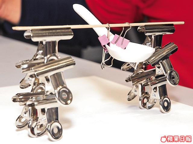 1.大文件夾砌成腳架,小文件夾夾着膠湯匙並以竹籤穿起,固定好。
