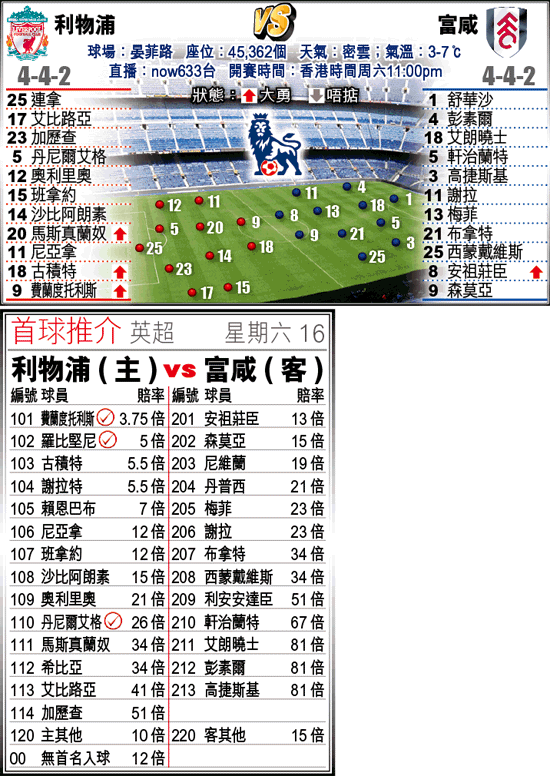 利物浦今屆主場表現特佳,加上在周六的英超迎戰富咸時,料有首席前鋒費蘭度托利斯復任正選,因此,就算有隊長謝拉特倦勤,利物浦仍夠贏,「讓球主客和」利物浦[-1]取「主勝」之餘,更可以敲勝2:0波膽。(球賽編號:星期六16;now633台今日11:00pm直播)