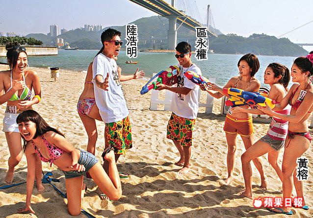黃榕、雷凱欣、Katherine、Naomi等昨日以火辣三點式到汀九麗都灣,為陸浩明及區永權新歌《區陸孖人》拍MV,雖然沙灘吹着凉風,幸好陽光為一眾性感少女提供熱能,未致太過寒冷。他們先分為兩組作沙灘排球對賽,球賽未開始,兩位男士先為少女塗太陽油,可謂艷福不淺。少女們穿起泳衣似足沙灘排球高手,可惜落場打波就雞手鴨腳,執波多過開波,最終陸浩明一隊接受大懲罰被水槍狂射。