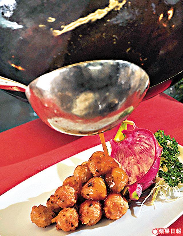 3.燒熱鑊下芡料,埋生粉水芡,淋上丸子面,最後撒上火龍果粒即可。