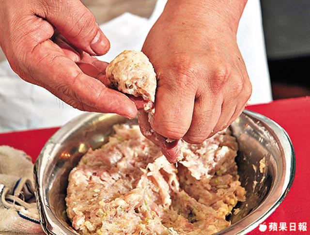 1.豬肉碎、蝦仁、冬菇粒及葱花,加入鹽、糖、胡椒粉及生粉拌勻,打至起膠,唧成丸子備用。