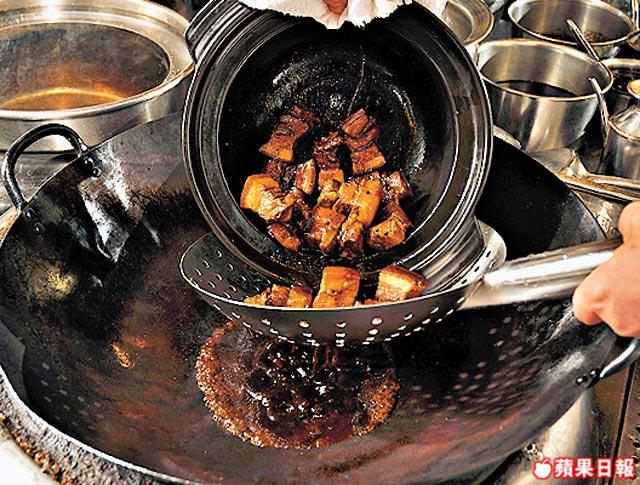 將五花腩煮得甘香,不是得個腍字,秘訣在於爆香料頭後要加五花腩一起炒香,待表面略焦才加水燜煮。
