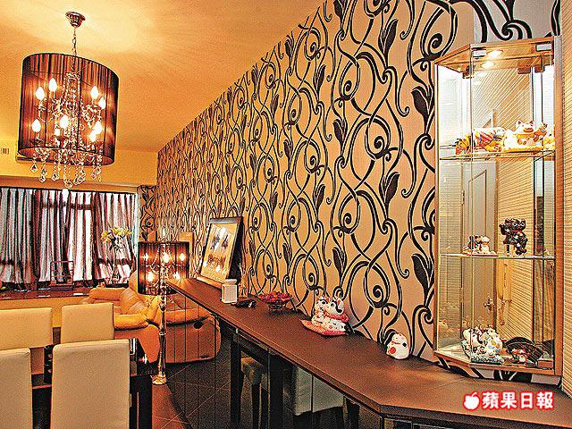飯廳的佈置盡顯設計師的心思,多處位置用上玻璃及大鏡延伸視覺空間,包括餐枱面的黑玻璃、貼牆而放的鏡面儲物櫃等,並配搭大花牆紙以及薄紗燈罩吊燈。