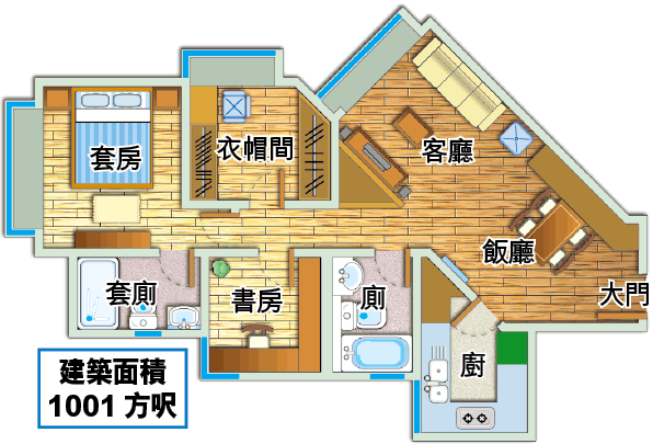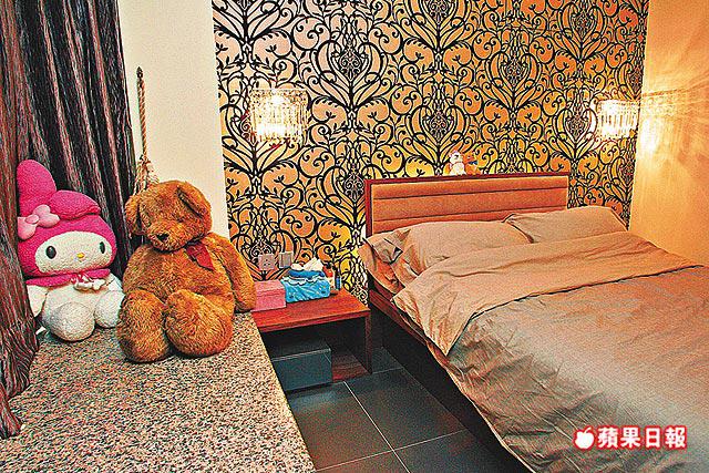 套房設計亦是走時尚華麗路線,以一幅主題牆引人注目,床頭背後整幅牆身鋪上花喱花碌的牆紙,並以水晶壁燈營造浪漫氣氛,帶黃色調使室內暖意洋溢。