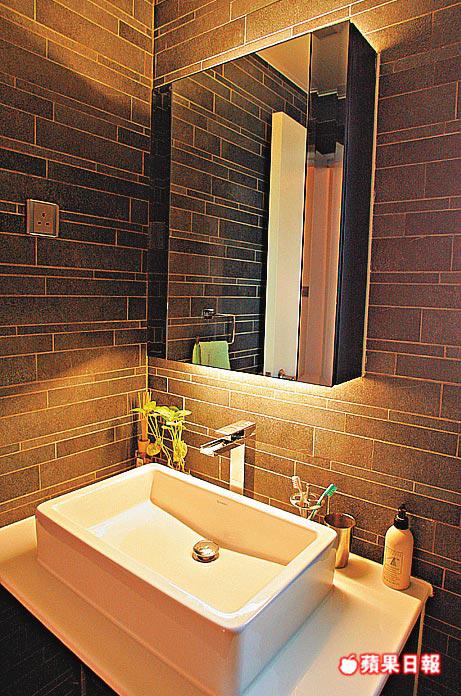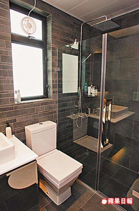 套房浴室屬於型格的灰色主調,地台鋪深灰色過底磚,牆身粗幼不一的長條磚,與地磚呼應。Roy指灰色過底磚價錢高低,主要視乎來源地,意大利磚每呎售價約200元,中國出產的過底磚,價錢平五成不等,每呎售價約90元。