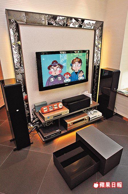 客廳的設計相對簡單,做一幅6呎闊乘9呎高的假牆安放電視地櫃,拉直電視機與梳化間的視野角度,令客廳變得方正整齊。假牆背後設計成一個三角形櫃,增加收納空間。假牆貼上白色閃砂牆紙,並以蝕花圖案灰鏡做裝飾框,形成一幅摩登特色牆,為客廳製造焦點。Roy表示,閃砂牆紙每卷售價大約1200元,約一卷可完成,而普通砂面牆紙每卷售價大約800元。