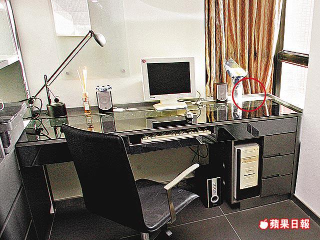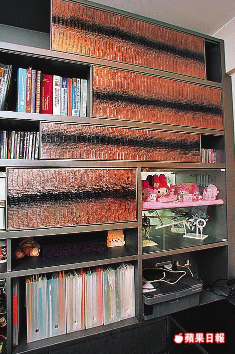 書房着重實用,只從細微裝飾上流露華麗風格。平凡的大型組合式書櫃,配鱷魚皮面趟櫃板。闢出部份作玻璃飾櫃,擺放別致裝飾物,豐富房間視覺層次。