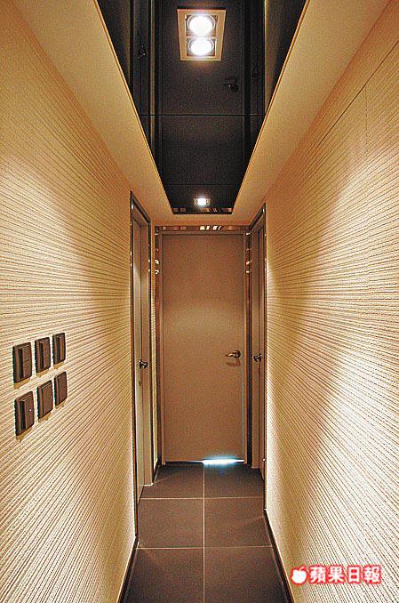 設計師連寢區走廊也不放過,加建鏡面天花,以射燈配襯,與走廊兩旁白色粗粒橫紋牆紙,形成深淺對比。