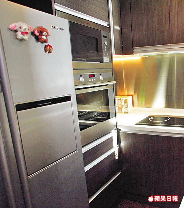 設計師在順應時尚華麗風格要求的同時,亦要兼顧實用的功能,廚房的設計正是一例。新造三摺式門貯物櫃,把門口旁邊的三角位修正,騰出空間存放雜物,而重新設計的廚櫃,貯物量更大。廚櫃選用深啡色木紋面,預留位置安放一系列以銀色為主的廚房電器。