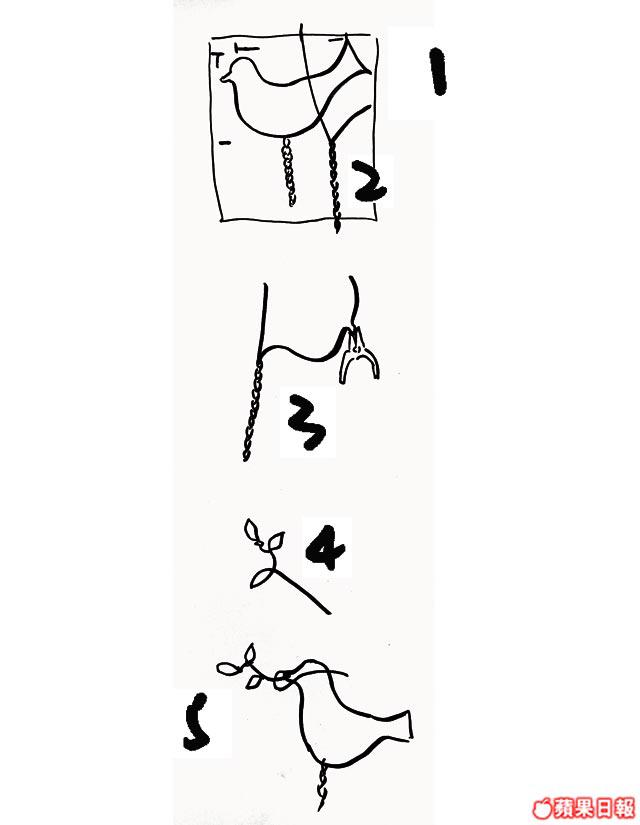 1.先在A4紙上畫出白鴿之形狀,以1.5mm之鋁線沿圖扭出鳥身;