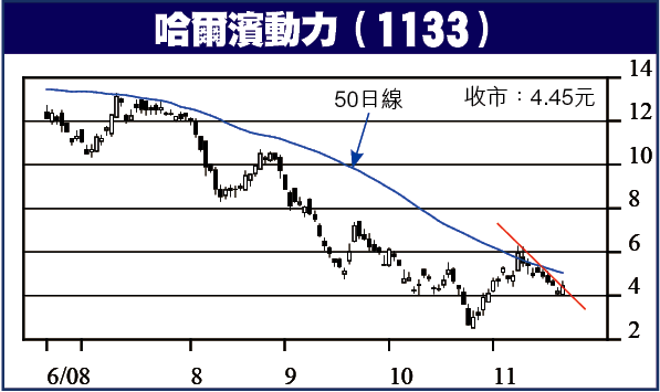 哈爾濱動力(1133)昨收4.45元,升5.95%,股價近兩周自50周線回落,先後跌穿10日及20日線,但前天現倒轉錘,昨天現破腳穿頭,股價有望開展反彈浪,上試4.85至5.05元阻力區,升越5.05元,可向5.50元推進。