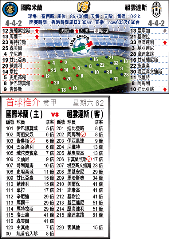 撇開此點,祖雲達斯近況亦較國米穩定,7連勝贏過的對手包括羅馬、皇家馬德里及當勇的熱拿亞,貨真價實,特別一提甘莫蘭尼斯去仗復出即間接建功,此君去季曾射破國米大門,今次是阿馬利與廸比亞路以外的財星佳選。