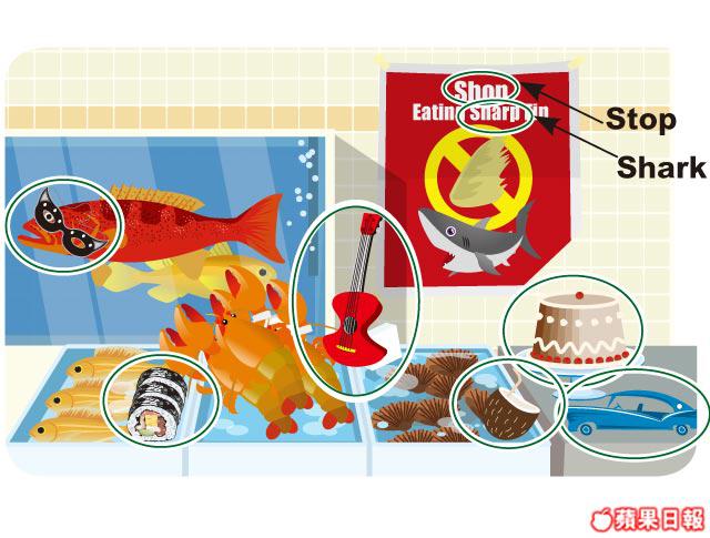 海海經過一家賣魚店,受污染所害,魚穫中竟藏有不少垃圾及雜物,再加上其他錯處,共8處之多,你能圈出來嗎?