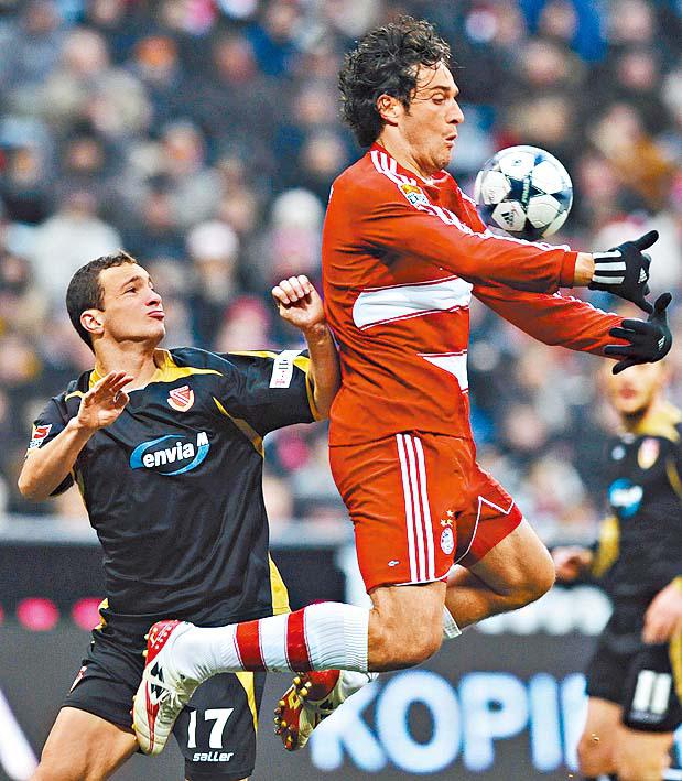 拜仁慕尼黑中鋒東尼(右)繼上周中為意大利國家隊建功,上周六亦為球隊攻入一球,結果拜仁主場以4:1大勝科特布斯。美聯社
