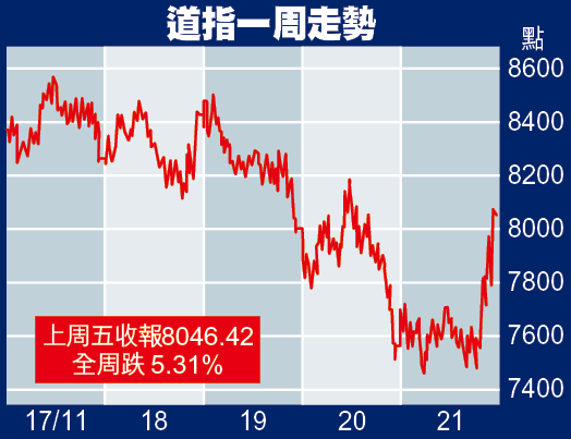 美股方面,上周五大部份時間均表現反覆,但其後市傳紐約聯儲銀行行長蓋特納將成為美國下任財長,加上油價反彈利好能源股,刺激美股在收市前1小時大幅抽升,道指收市勁揚494點或6.5%,報8046點,納指亦升5.2%,收報1384點。但全周計,美股3大指數均連跌3周,其中道指和納指上周分別挫5.3%和8.7%。