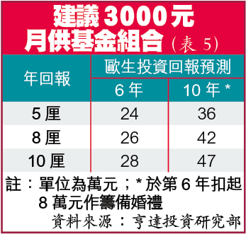 以最保守回報5厘計,6年後基金組合可滾存24萬元,足夠籌備婚禮所需。其後繼續月供,回報如達10厘,10年後就可儲47萬元,屆時歐生已有能力支付150萬元的物業首期(表5)。