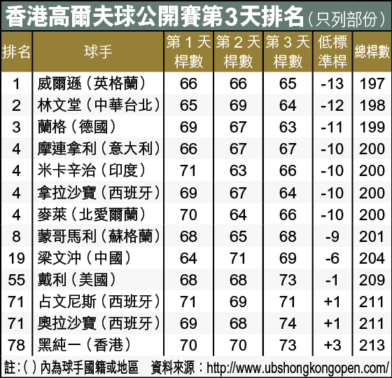 德國老將蘭格及蘇格蘭名將蒙哥馬利,昨在香港高爾夫球公開賽表現出色,分別升上第3及第8。兩人能否重溫在粉嶺奪標的舊夢,還要接受多名冒起的歐洲球手挑戰;其中暫以低13桿領先的英格蘭球手威爾遜自言狀態大勇,有信心在港打破「二奶」宿命。(now631及671台今日2:00pm直播)
