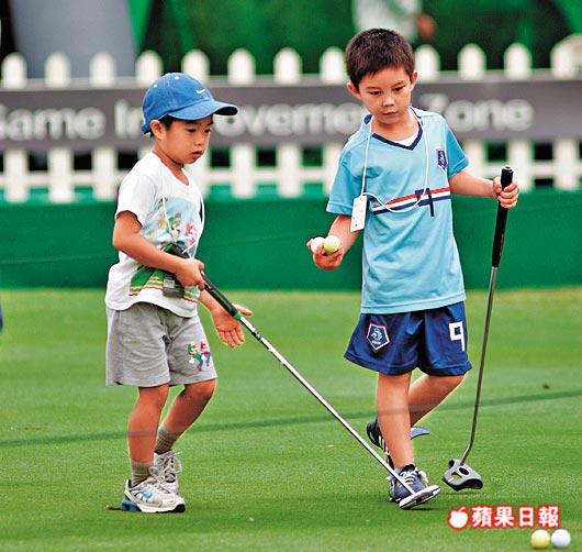 香港公開賽每年都有不少人一家大細入場觀賽,可能賽會見越來越多家庭客,所以過去幾年都設立小朋友區(圖)。今年更加擴大面積,既有推桿區、又有擊球區;不少家長坐在草地,睇住小朋友學推桿。見到小朋友以如曲棍球桿的「迷你球桿」玩高球,不知幾開心同放心。