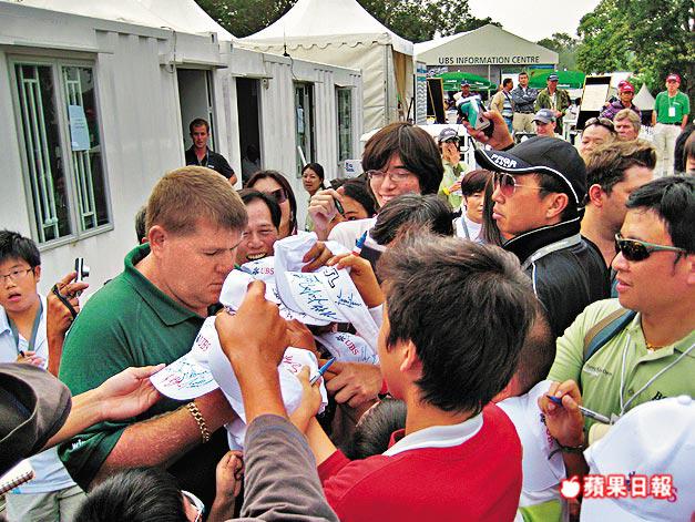 賽會為方便球迷向球星索取簽名,如以往一樣設立簽名區。現場所見,有不少球迷波都唔睇,實行留在簽名區附近,等球星完成比賽便上前索取簽名。雖然美國球手戴利(左一)昨日成績麻麻,但未有影響球迷熱情;他甫現身簽名區即被包圍,而戴利亦友善地為球迷簽名。
