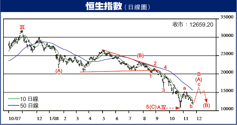 中浪(C)小浪4可以於11月5日的15318見頂;15318亦可以是小浪4的細浪(a)高位,隨後的回落為細浪(b)調整,有機會於11815見底,然後出現細浪(c)反彈。整個模式可以「曲折形」方式升破11月5日高位才完結,亦可以「三角形」模式爭持於15320/11800之間一段時間,然後再下試9300/9500來完成中浪(C)小浪5的下跌。