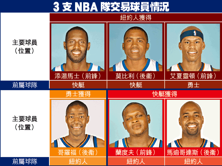 【綜合美國外電】紐約人「大清倉」!紐約人在上周五與金州勇士及洛杉磯快艇,進行涉及6名球員交易,紐約人將前鋒蘭度夫及後衞馬廸哥連斯交易至快艇,換來前鋒添湯馬士及後衞莫比利;並將後衞哥羅福交易至勇士,換來前鋒艾夏靈頓,為2010年「釣大魚」行出第一步。