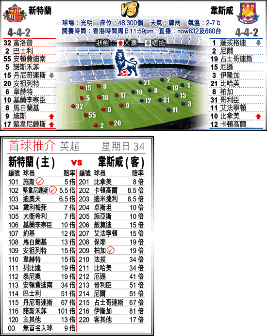 新特蘭雖然近況麻麻,但在周日的英超聯對手韋斯咸近態更差,而且「黑貓」一對前鋒施斯及堅韋尼鍾斯當銳,加上有主場之利,新特蘭少讓平/半,宜取上盤。(球賽編號:星期日34;now632及660台今日111:59pm直播)吾中