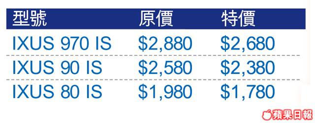 數碼相機鬥像素?鬥功能?計我話鬥平最實際!像Canon將三款IXUS降價,最矚目有970IS,1,000萬像素配搭5倍光學變焦鏡頭,仲有FaceDetection及臉色優化,但芒就細啲,只有2.5吋。另外還有3吋大芒嘅90IS及有5種色機身嘅80IS,可以考慮做聖誕禮物。