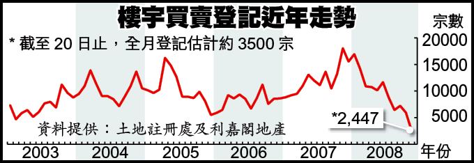 金融海嘯影響置業人士入市意欲,物業交投嚴重萎縮,甚至差過沙士時期。據土地註冊處數據,本月首20天,全港樓宇買賣登記僅2447宗,較10月同期3742宗大跌35%;成交總額亦跌28%至約69.31億元。