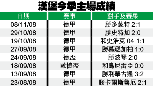 漢堡今季改以敗走英超的荷蘭教練祖爾執教,加上季初又有雲達華治轉戰西甲皇家馬德里,故不被外界看好,誰不知卻予人驚喜。雖說他們於客場聯賽非常不濟(2勝1和4負),惟於主場成績突出,6戰取得5勝1和(見附表)。