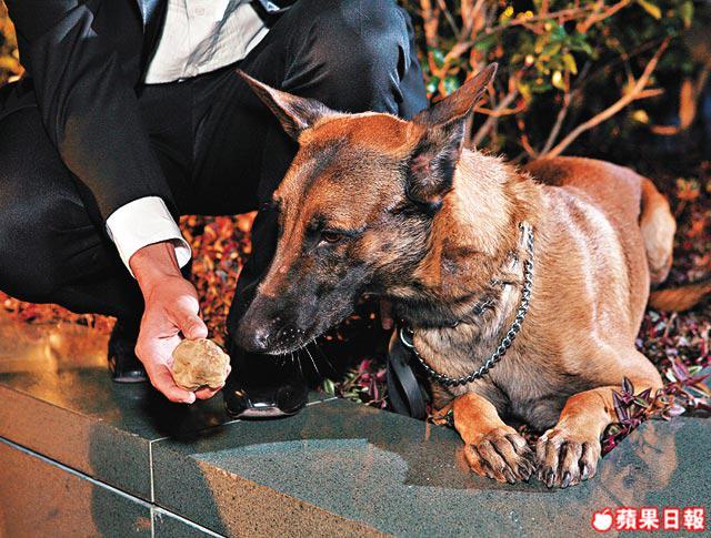 原來一隻好的獵犬,可值數萬至10萬港元,是獵人的好拍檔也是寶物,為免令牠勞累,當晚表演的獵犬,是香港狗隻訓練員Daniel的愛犬Spike,牠受過緝毒訓練,對氣味特別靈敏,訓練3星期就可出來表演。「訓練獵犬有4個步驟,第一,是給牠們去玩,拋出去再接回來,認到松露的氣味;第二是讓牠們去嗅,嗅完收起叫牠們找,找到有獎勵;第三,埋在淺泥去找,然後越埋越深;第四就是戶外實習。訓練一隻真正的松露獵犬,一般要2-4年,因為好多松露都在泥下一至兩呎深生長,要嗅到這樣深,訓練需時。」Gianni還說,做獵人要「蠱惑」,「松露獵人沒有屬於自己的範圍,有牌照便可到處搜索,為了不讓行家知道白松露所在,只會在凌晨穿上深色衫帶獵犬上山找,掘到又會翻好泥土,將大塊的收在衣袋內,碰到行家只會拿身上一兩塊最小的出來,大嘆白做!看Gianni外表老老實實,真係估佢唔到。
