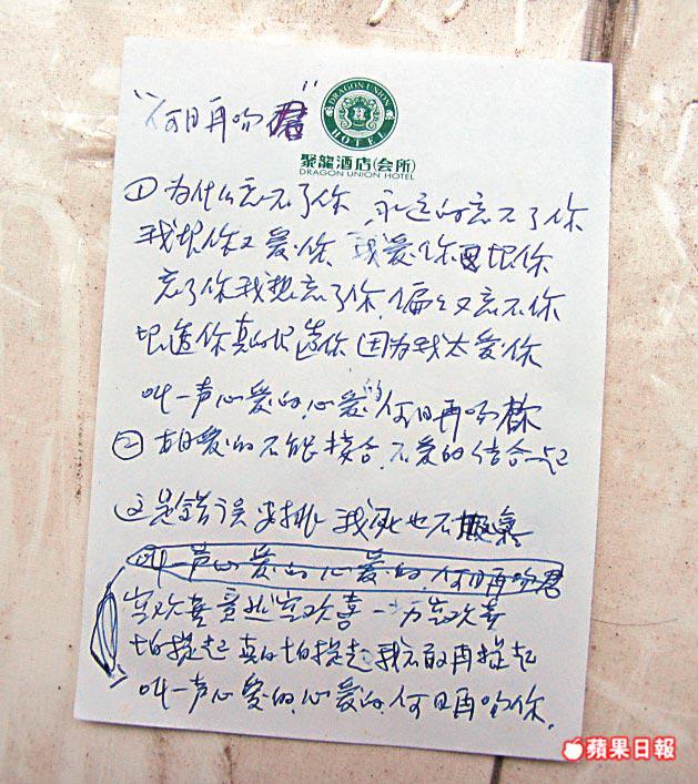 受害人姓庾(36歲),湖南人,有女護士資格。她留下的遺書以「何日再吻君」為題,既愛且恨說:「為甚麼忘不了你……我恨你又愛你……真的恨透你,叫一聲心愛的、心愛的,何日再吻你。」庾女透露,她去年初來到深圳布吉私人診所做護士,至去年底丈夫涉偷車被捕,兩人離婚,6歲兒子跟家翁一家生活。