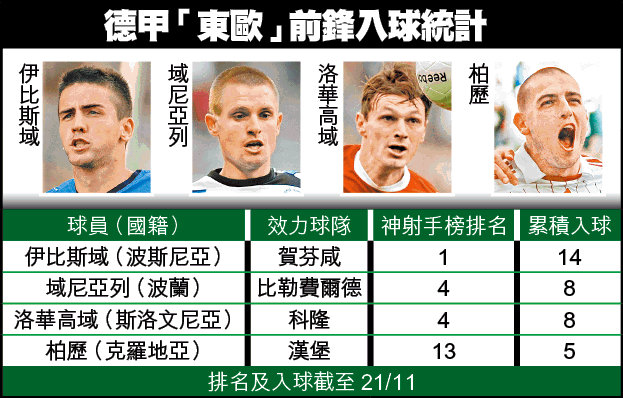 論整體財力,德甲在歐洲4大聯賽恐怕僅排末席,球隊找不到巴西、阿根廷或西歐強國外援,只好退而求其次,找價廉物美的東歐前鋒;周日主場出擊的漢堡,就有一對克羅地亞前鋒組合柏歷及奧歷,而季初最「爆發」的東歐前鋒,就是神奇球隊賀芬咸的伊比斯域。