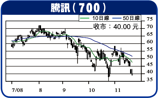 今年首9個月純利19.15億元,較07年同期增長82%。集團相信其互聯網增值服務及無線增值服務屬於低消費項目,於經濟低迷時期所受影響較少。事實上,佔總收入達69.2%的互聯網增值服務,第3季收入較第2季上升35%至14億元,長遠前景會比網絡廣告業務更具抗禦力。可於39元吸納,目標46元,35元止蝕。
