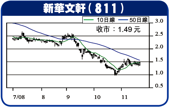 主要業務為圖書零售及向學校發行教材,雖然收入主要來自四川,但是教科書業務應不會受地震及經濟減速太大的影響。現時預測PE不足4倍,每股淨現金有2.05元,較現價有35%折讓,既然公司收入穩定,又持有大量現金,市場資金壓力紓緩時可望拉近折讓,建議候1.30元買入,持有一段較長時間,目標價2元,止蝕1元。