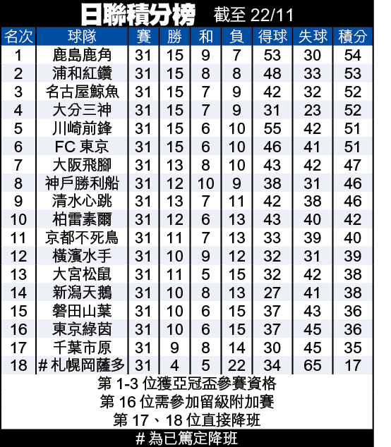 上季日聯,鹿角最後9周錄得全勝,但仍要靠浦和紅鑽那邊失準才可後上封王;豈料天助鹿角,紅鑽最後5輪不勝兼在最後一周不敵篤定降班的FC橫濱,結果鹿角有運地奪得聯賽冠軍。