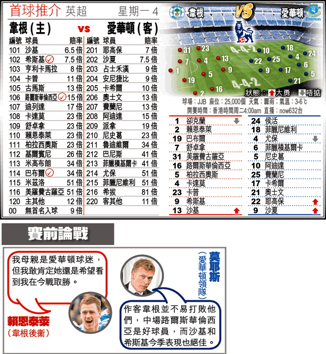 愛華頓對上5場比賽取得3勝2和,而今季於客場聯賽亦有出眾演出,6戰錄得4勝1和1負,另說到於英超對韋根往績亦贏晒,近6戰3勝2和1負,故今訪韋根理應值得捧場。他們前線有卡希爾、費蘭尼、耶高保及沙夏等好波之人,攻力毋庸置疑,可是個人對他們的防線就存有戒心。