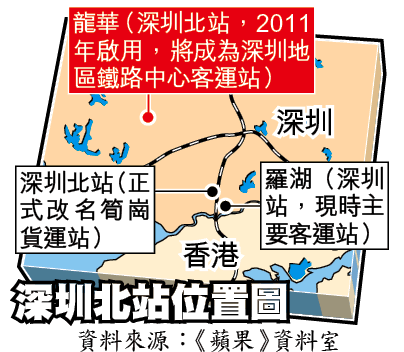 深圳市政府前日主辦審查會,會上專家一致通過深圳北站的設計方案。新車站位於龍華二線擴展區中部,北鄰未來龍華中心區,佔地逾58萬平方米,建築面積39萬平方米,有20條軌道,預計在2011年6月啓用。