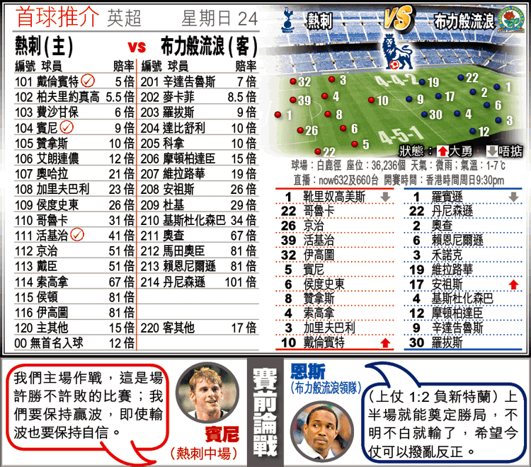 另外,雖說今場料有後衞賴恩尼爾遜及馬田奧臣傷癒復出的布力般,近季訪熱刺表現好,6戰取得2勝2和2負,可是於今年在英超對倫敦球隊成績一般,8場比賽錄得1勝2和5負(見附表),如只計今季則是1勝3負。