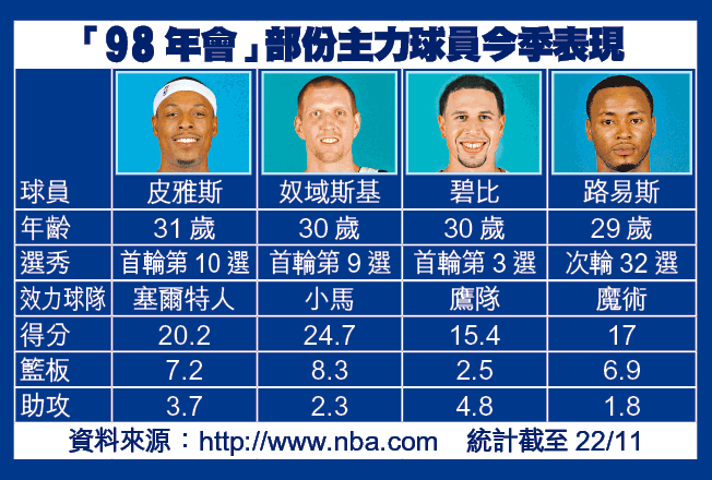 「98年會」中,論成就,當然以上年帶領塞爾特人贏得總冠軍、且獲得總決賽MVP的皮雅斯最成功;他當年以第10選(見附表)加盟,到今季已是他第11個球季,上季幾經辛苦登頂,今季卻未有放鬆,季初回到訓練營時更是最「弗」的一個,難怪他帶領的塞軍能與湖人一時瑜亮。