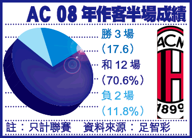 沒看錯!是7成!08年以來,AC米蘭在意甲的「主客和」分佈散,「半場主客和」則單純得多,17場作客中竟有12場「半和」,勝負往往到下半場才出現。去季這個作客對拖連奴的場次,AC米蘭亦半場與對方互交白卷,到下半場才由柏圖奠勝。