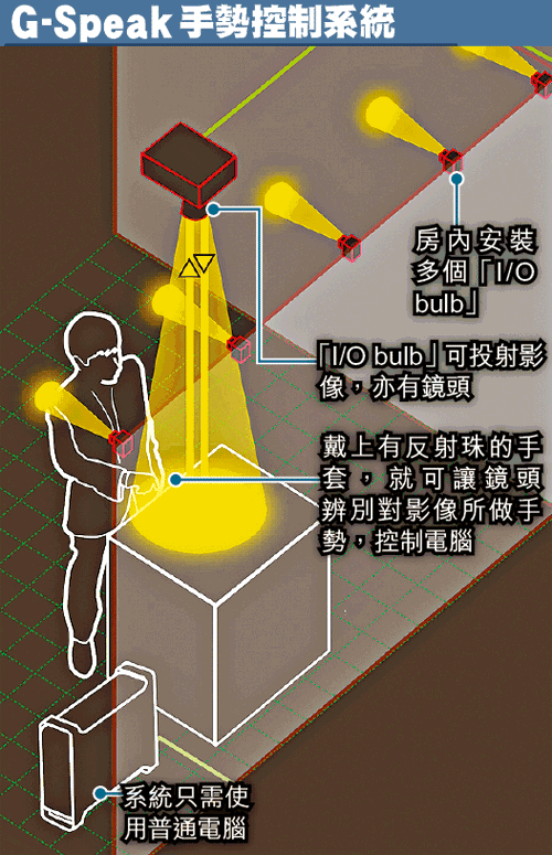 洛杉磯Oblong公司發明的G-Speak系統,是在房間安裝多個兼集投射器和鏡頭於一身的「I/Obulb」,用者穿上有反射珠的手套,就可偵察到做了甚麼手勢。用手指指,就可選擇屏幕上物件,手向後拉,就放大物件,手撥向一邊,就把物件移開,就像隨心而發那麼自然,比滑鼠方便得多。