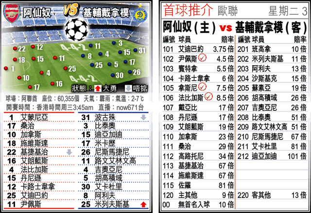 近期陷於低谷的阿仙奴,周二在歐聯G組主場面對基輔戴拿模,考慮法比加斯、艾廸巴約等主力可望復出,加上近季主場對東歐球隊多大炒,一於博阿仙奴反底,取「讓球主客和」「主勝」。(球賽編號:星期二3;now671台明日3:45am直播)